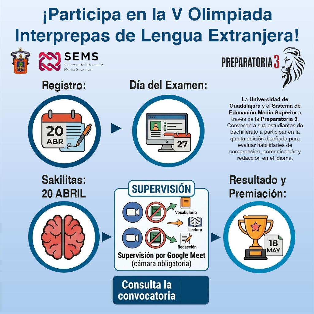 La Universidad de Guadalajara, a través del Sistema de Educación Media Superior (SEMS) y la Preparatoria 3, lanzó la convocatoria para participar en la V Olimpiada Interprepas de Lengua Extranjera, un evento académico que tiene como propósito fortalecer el aprendizaje significativo del idioma inglés, así como impulsar el desarrollo de habilidades de comunicación en una segunda lengua entre estudiantes de bachillerato.